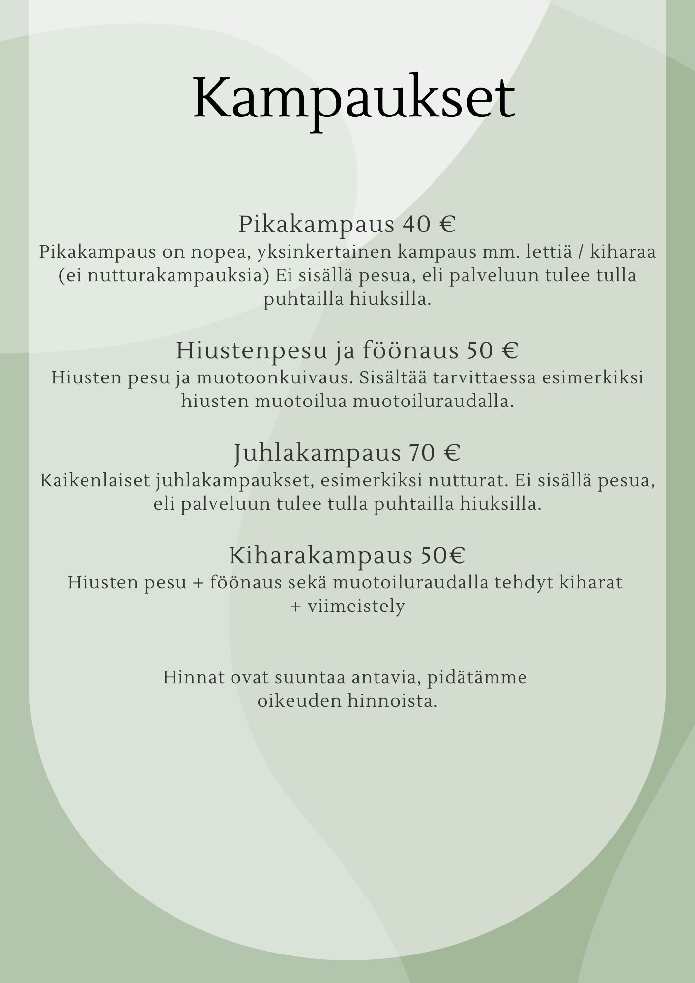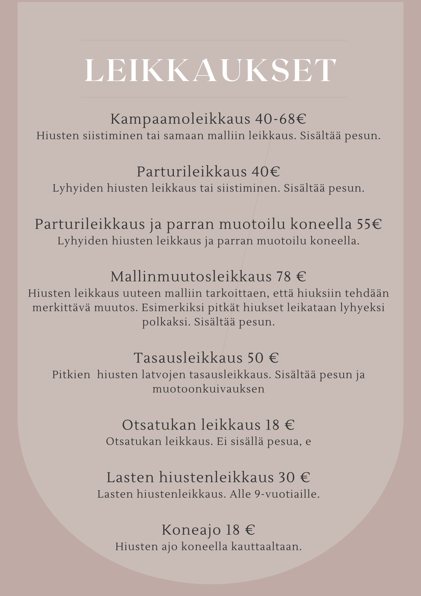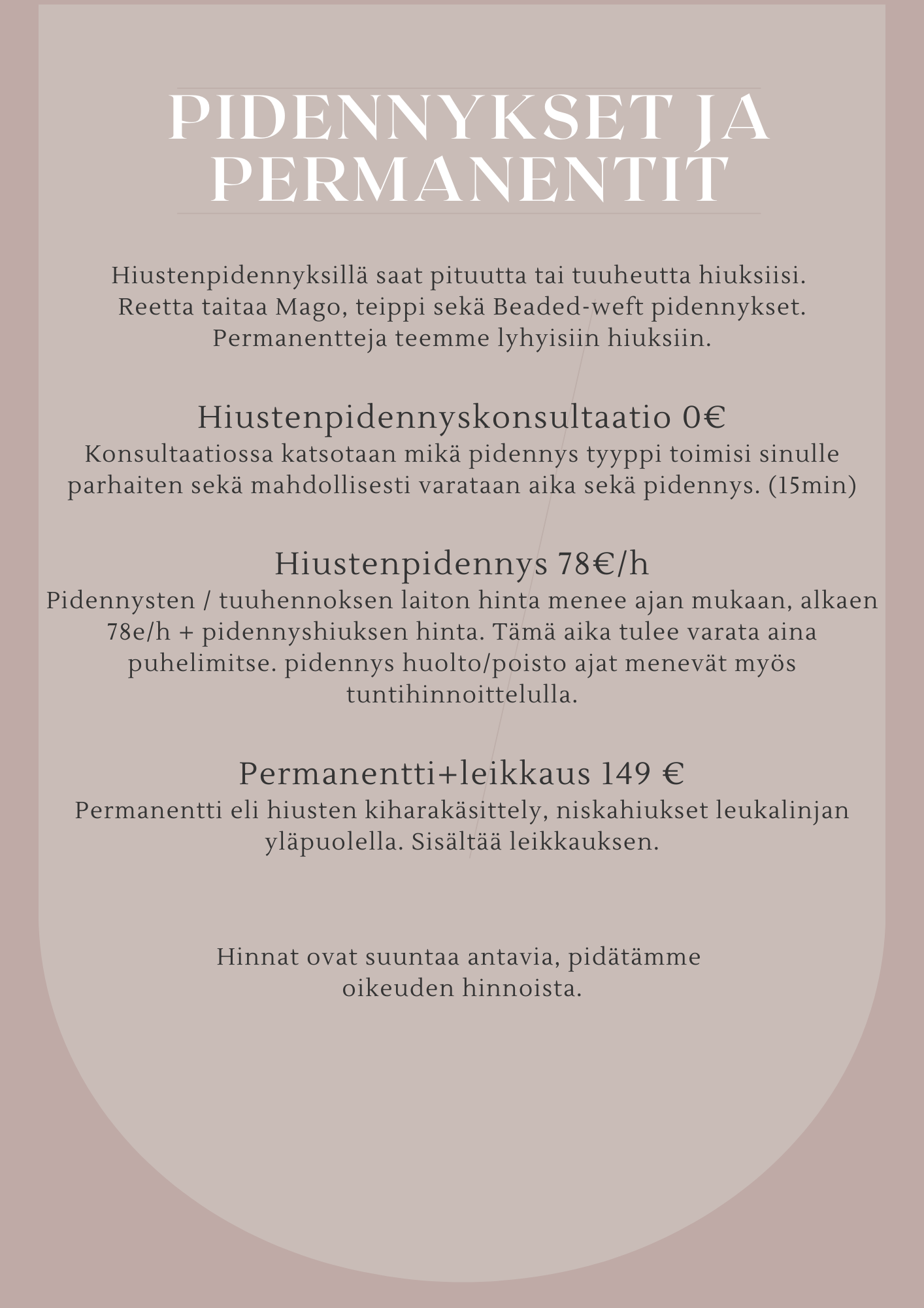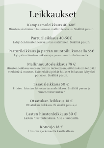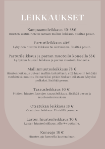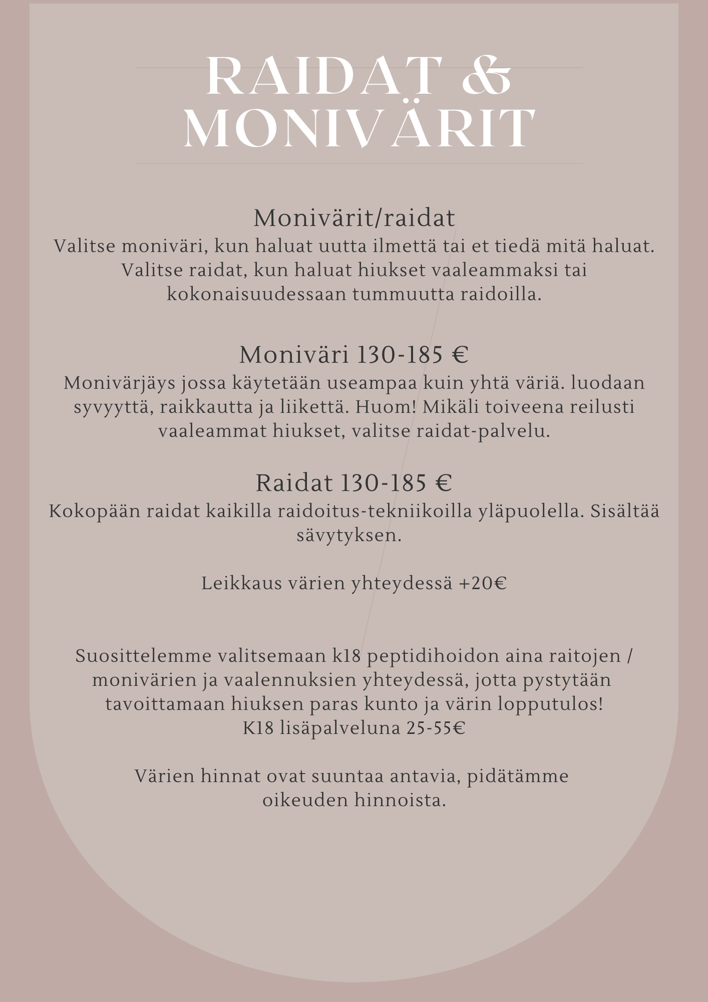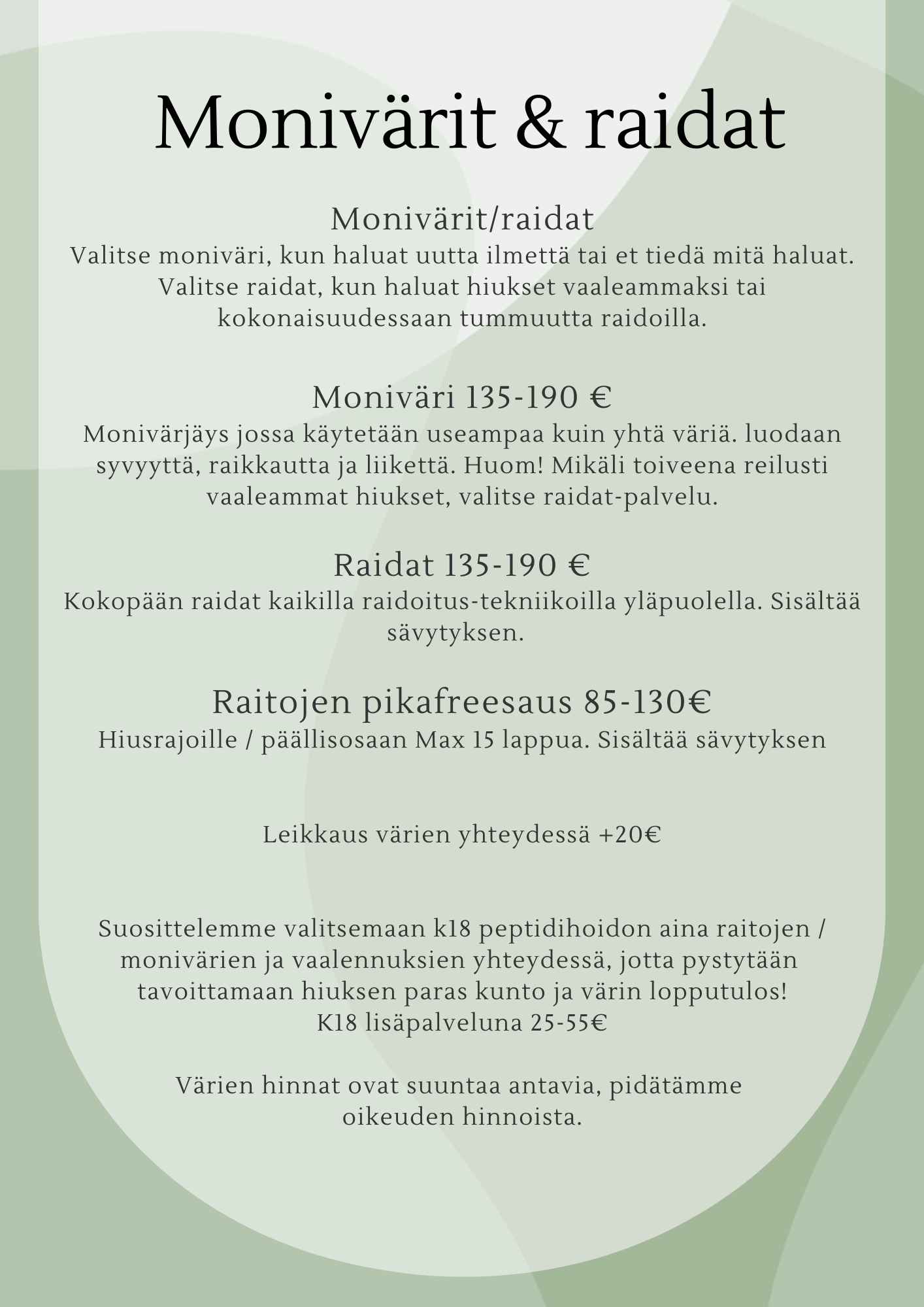 Muudin palvelut Varaa aika LEIKKAUKSET VÄRIT RAIDAT / MONIVÄRIT KAMPAUKSET PIDENNYKSET MUUT PALVELUT Muudi salon050 550 1597info@muudisalon.fiTaiteentekijäntie 7, 00350 Helsinki