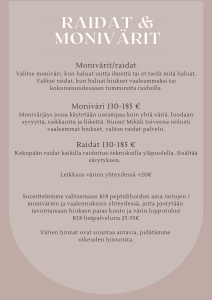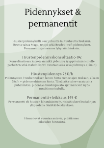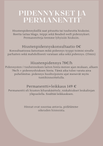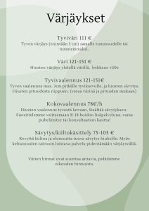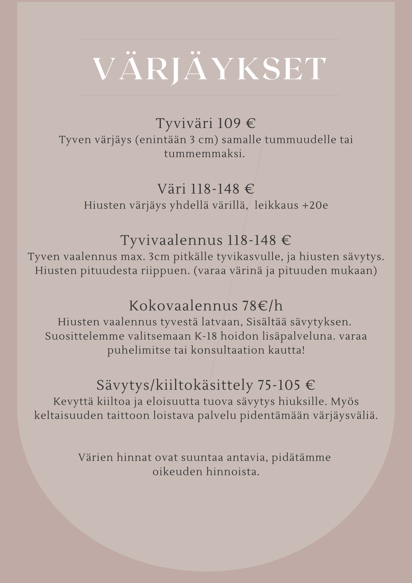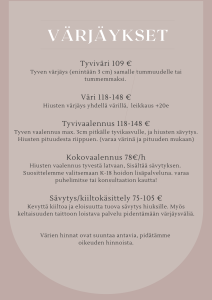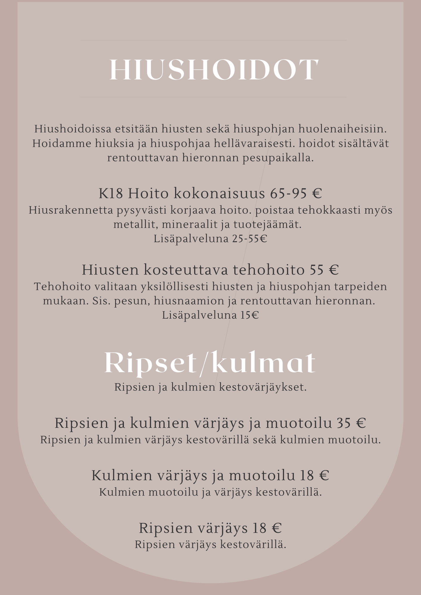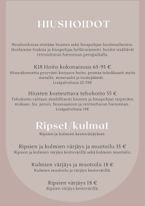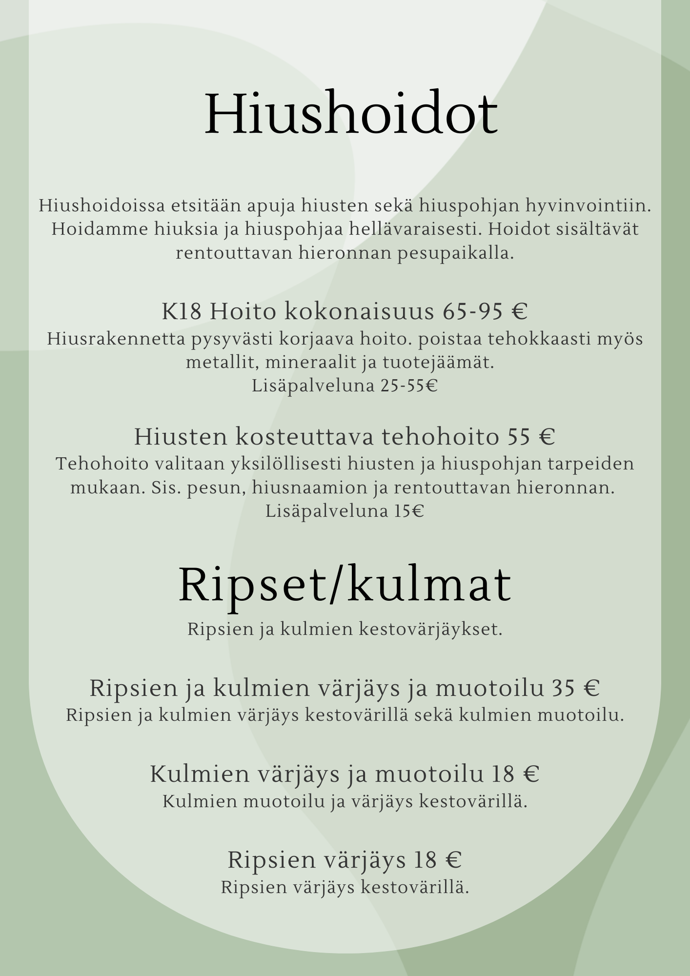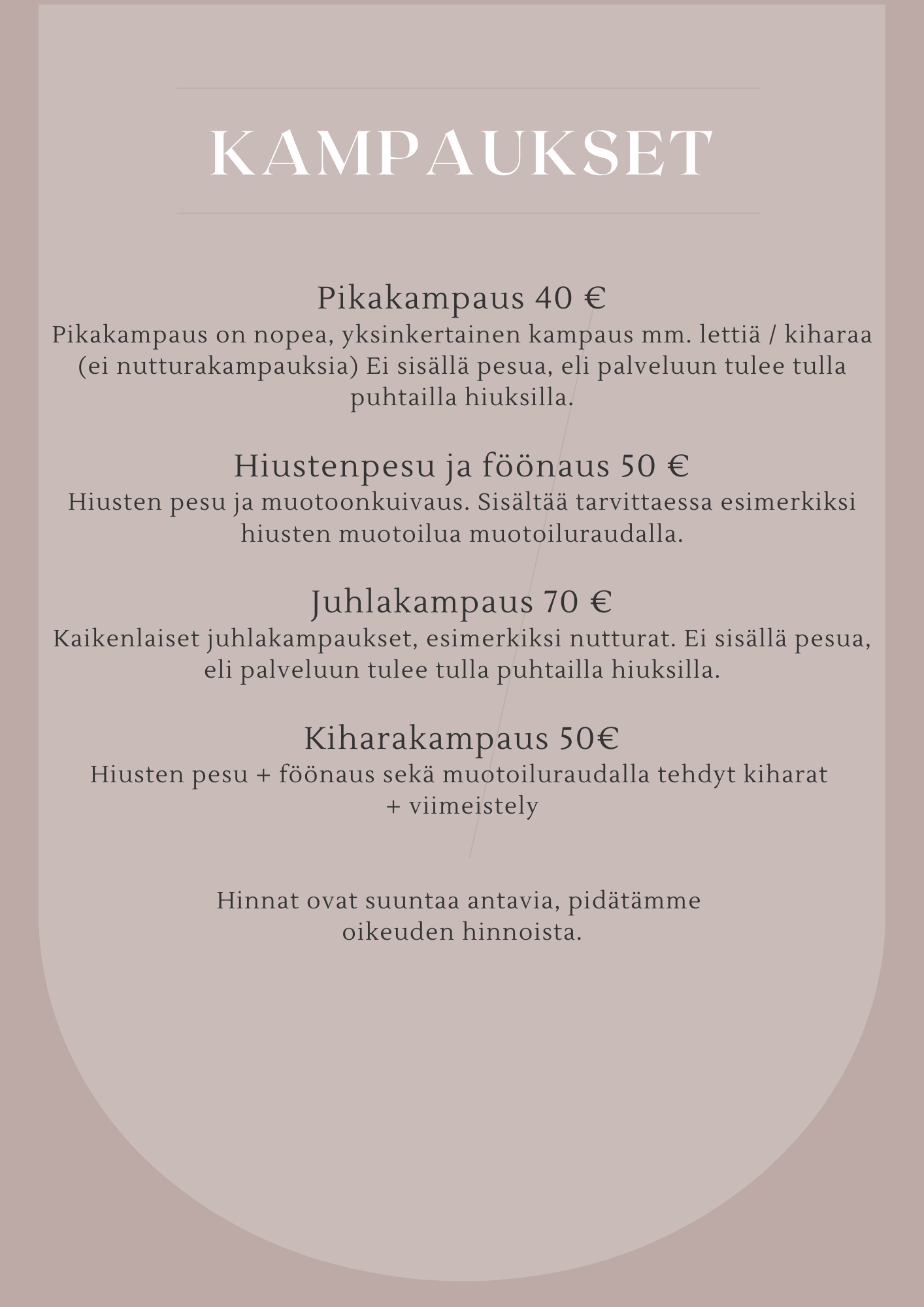 Muudin palvelut Varaa aika LEIKKAUKSET VÄRIT RAIDAT / MONIVÄRIT KAMPAUKSET PIDENNYKSET MUUT PALVELUT Muudi salon050 550 1597info@muudisalon.fiTaiteentekijäntie 7, 00350 Helsinki